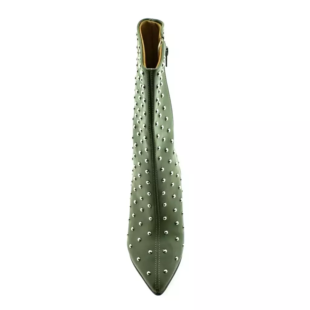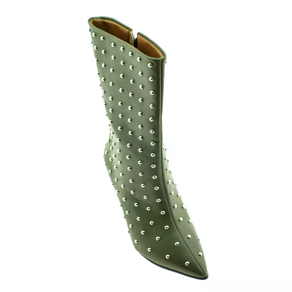 ¡Marca tendencia con la audaz bota con tachas de taco fino verde Zatz! Su vibrante color verde es el lienzo perfecto para las tachas estratégicamente dispuestas, que le otorgan un toque rockero y lleno de actitud. El elegante taco fino estiliza tu figura, creando un contraste impactante entre rebeldía y sofisticación. Perfecta para quienes no temen destacar. Disponible en tallas 35 a 40.